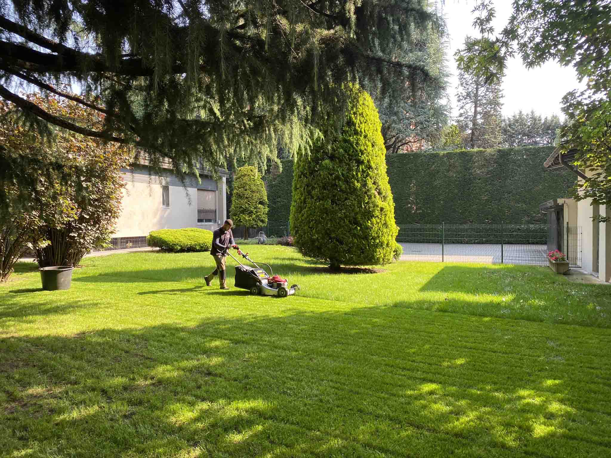 Manutenzione ordinaria giardino condominiale con prato. Sfalcio, cura del suolo, irrigazione calibrata