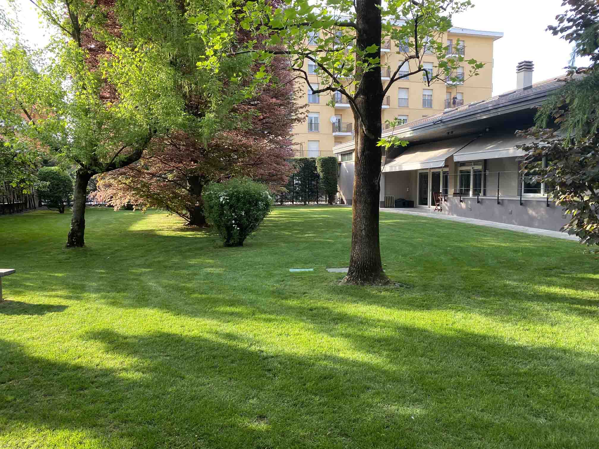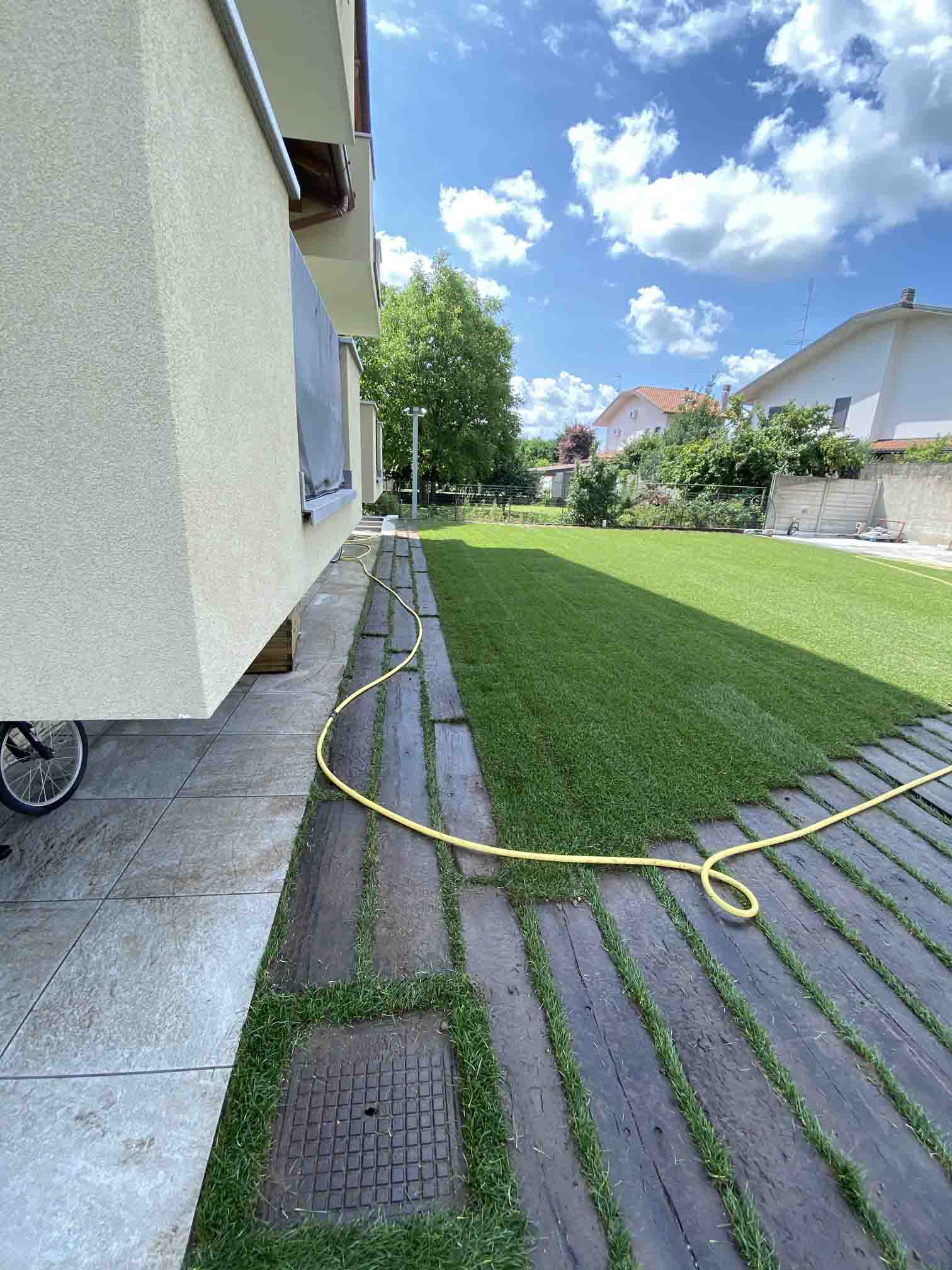 Manutenzione ordinaria giardino condominiale con prato. Sfalcio, cura del suolo, irrigazione calibrata