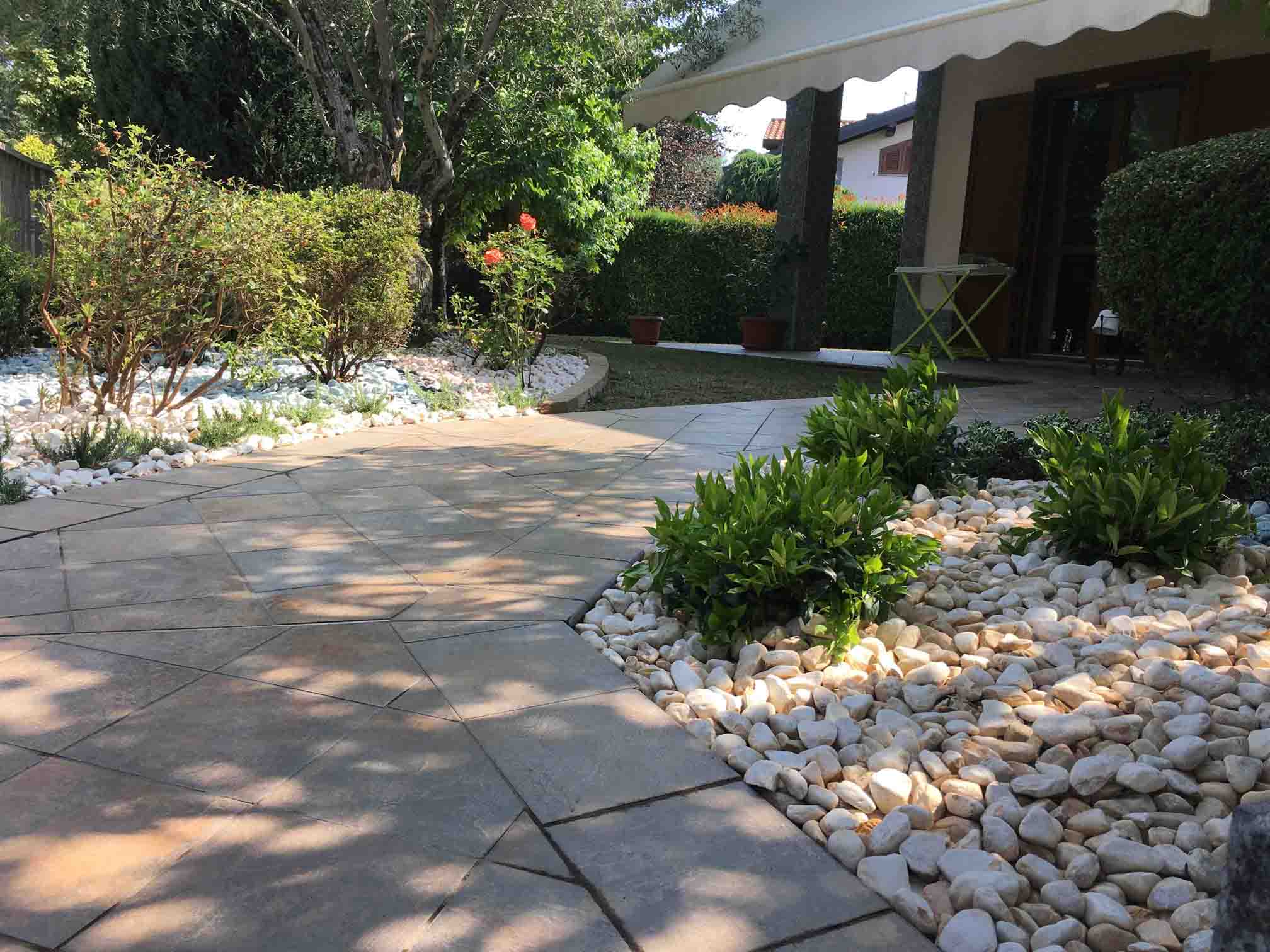 Realizzazione di pavimentazioni, vialetti, marciapiedi e aiuole in giardino privato. Pacciamatura, camminamenti, scelta piante, piantumazione fiori